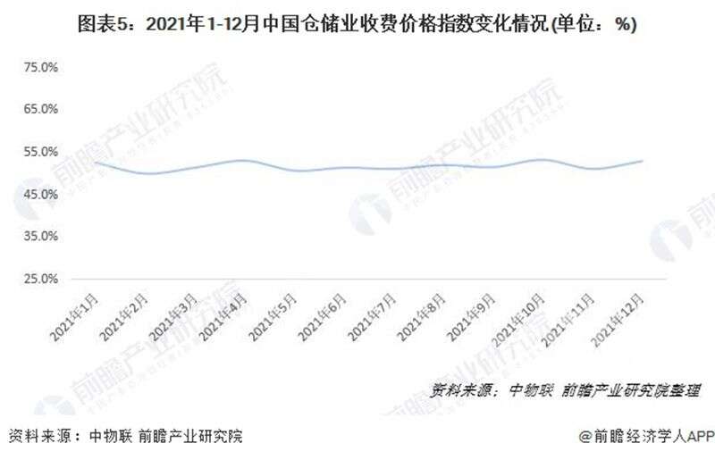 2021年,收費(fèi)價(jià)格指數(shù)均值為51.7%,高于2020年1.6個(gè)百分點(diǎn),指數(shù)連續(xù)十六個(gè)月未落入榮枯線以下,表明倉(cāng)儲(chǔ)業(yè)務(wù)收費(fèi)價(jià)格保持上升勢(shì)頭。